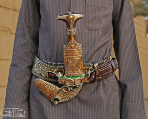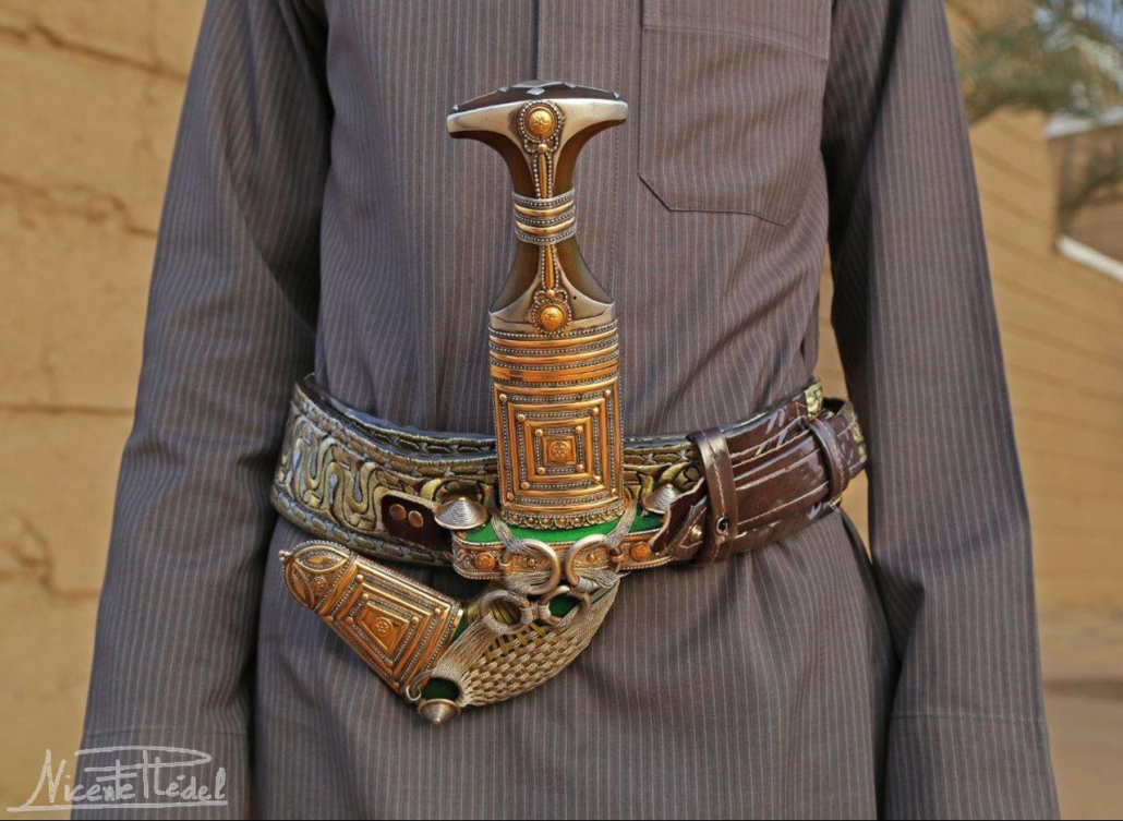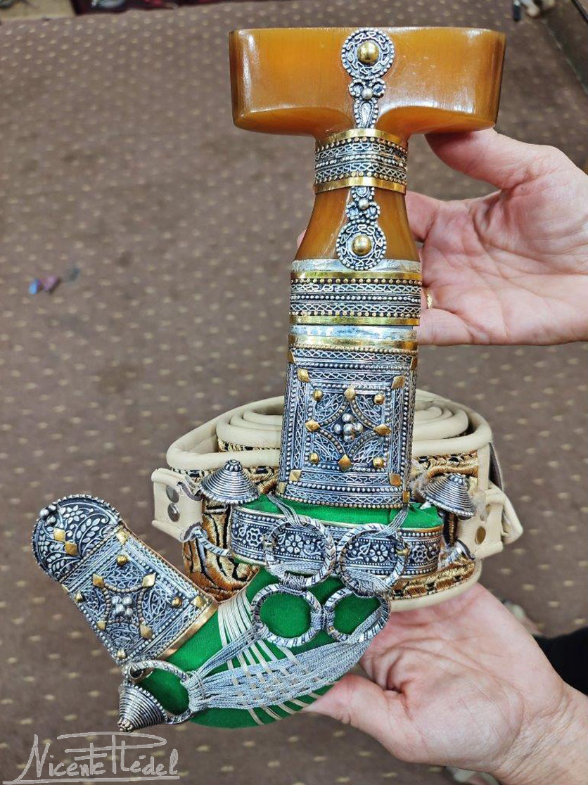Fue en Yemen donde tuvimos por primera vez contacto con esta peculiar daga árabe cuyos orígenes se remontan a miles de años atrás, hasta ubicarnos en la era del reino bíblico de Saba. De hecho, una de las vetustas estatuas descubiertas muestra la figura de un monarca de Saba luciendo esta elegante daga.