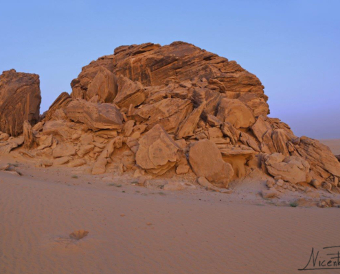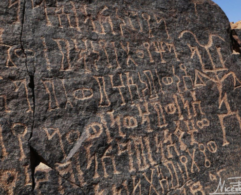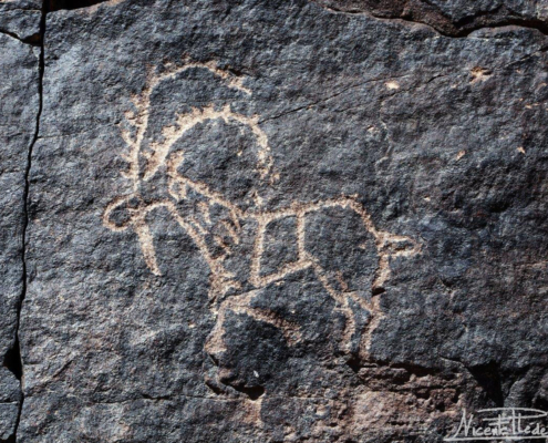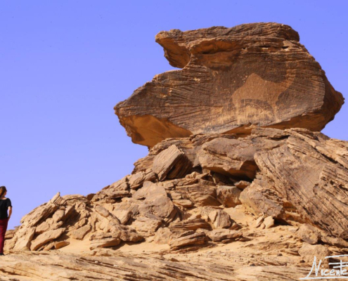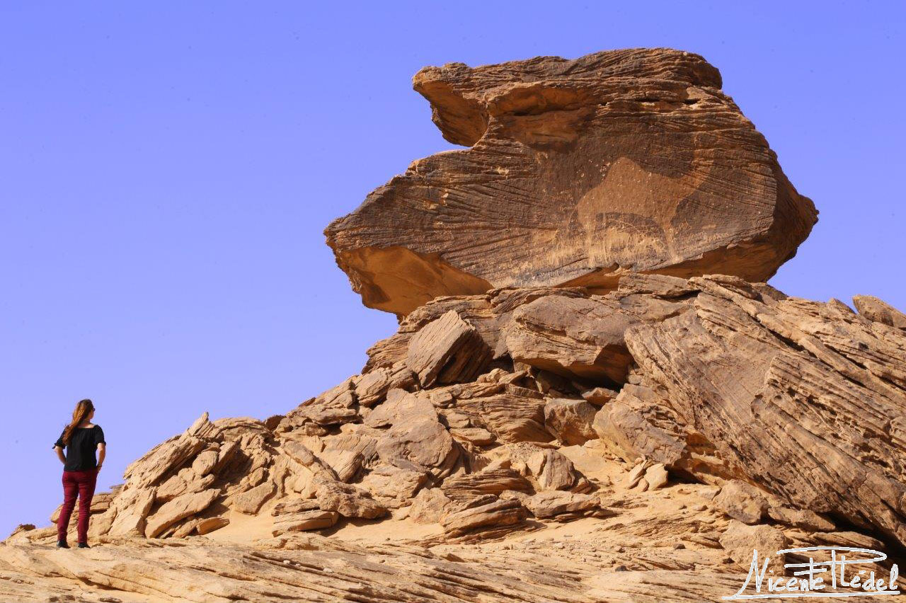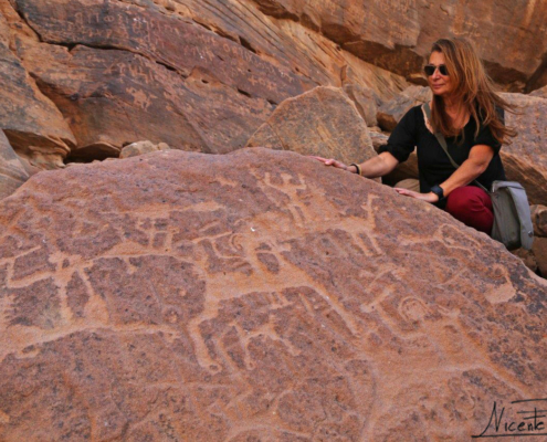 Hace más de 7.000 años, la vida silvestre y el agua cubrían las resecas arenas del desierto por el que avanzamos. Todos los seres vivos que disfrutaban de un bucólico ecosistema fueron desapareciendo poco a poco con la desertización. Afortunadamente, los diversos episodios de la historia que se fueron sucediendo a lo largo de milenios, quedaron plasmados en las rocas por sus sagaces habitantes. También pastores nómadas, viajeros, comerciantes, ejércitos… fueron dejando su huella mediante inscripciones y petroglifos en un entorno que iba mutando.
