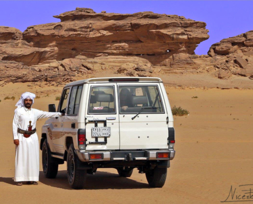 Con Abdulá, dejamos nuestro exuberante oasis de Nayarán para introducirnos en el desierto puro y duro. Entre rocas y arena se nos va revelar en la zona de Hima, otro de los maravillosos tesoros que posee Arabia Saudita y que se ha sido reconocido por la UNESCO como Patrimonio de la Humanidad.