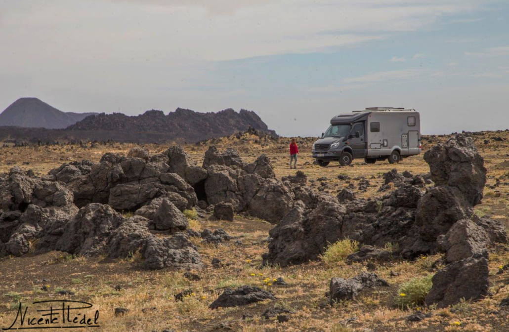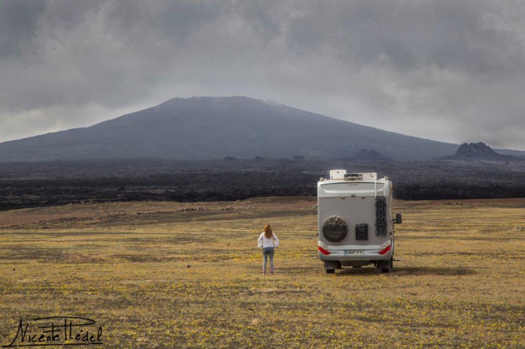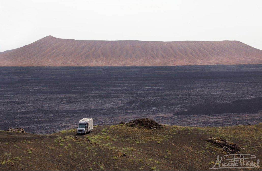Cuando escalamos a las crestas de algunos de los primitivos cráteres dormidos con el camper, el espectáculo visual que nos rodea es emocionante y embriagador. Lechos inmensos de lavas milenarias se despliegan como una espesa túnica de piedra oscura a los pies de volcanes negros y… blancos.