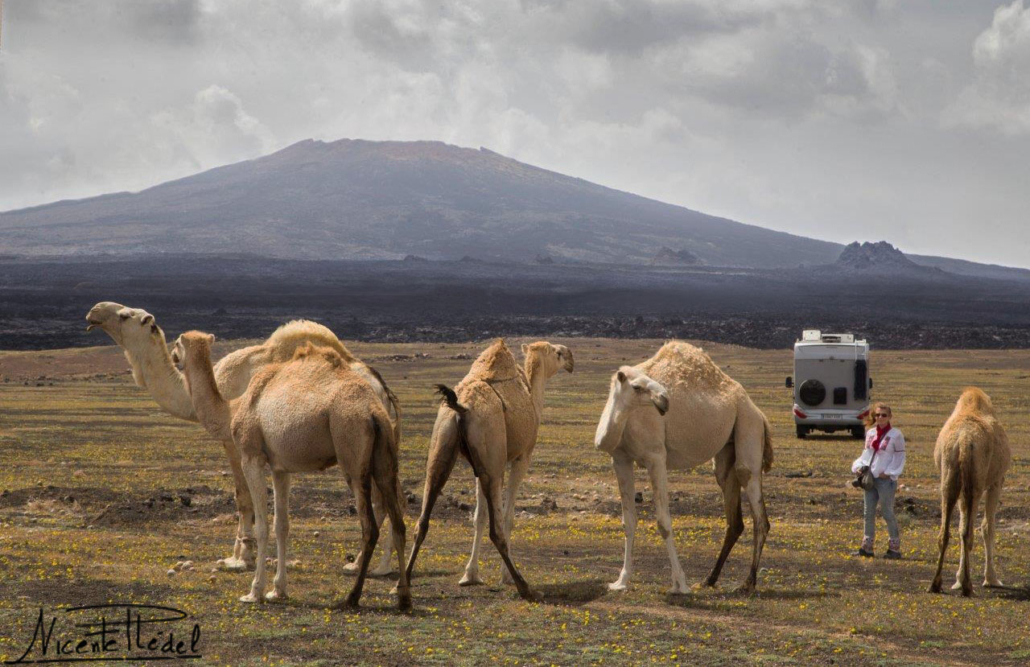 Por las mañanas cruzan nuestro campamento rebaños de camellos que lánguidamente se alimentan de los pequeños brotes de hierbas y flores que se abren paso entre lava reseca y trozos de piedra pómez sobre la que pasean sus huesudos cuerpos. Los camelleros nos saludan con una mezcla de sorpresa y flema, sin perder de vista a sus rebaños.